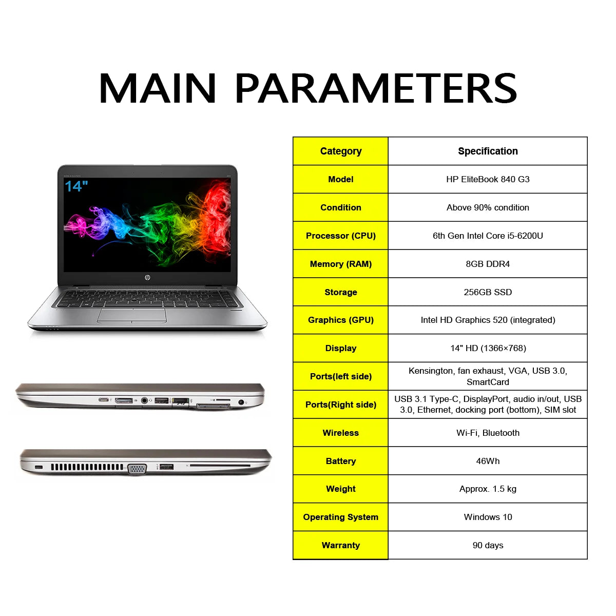 Used HP EliteBook 840 G3 Business Laptop Intel Core I5 6th Gen CPU 8GB RAM 256GB SSD Original Refurbished Computer Used Laptop