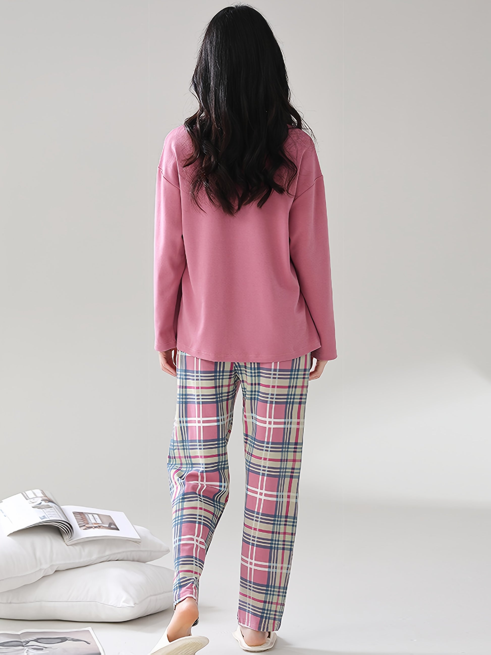 Women'S Cozy Pink Plaid Pajama Set - Long Sleeve Crew Neck Top & Wide-Leg Pants, Casual Fall/Winter Sleepwear, Soft & Comfortable, Perfect for Home or Relaxation, Relaxed Fit Pajamas | Plaid Pattern Pants | Soft Fabric Pants,