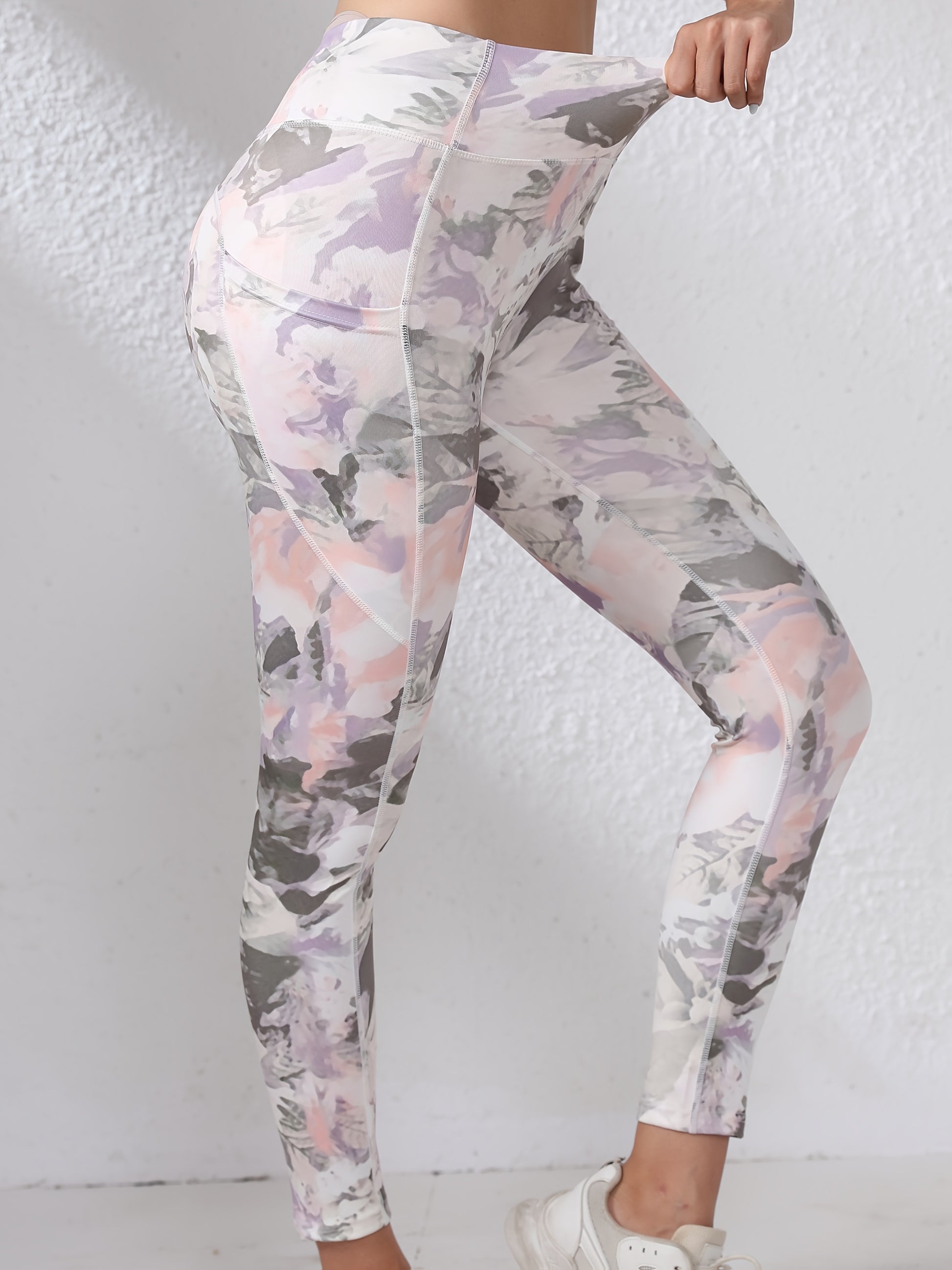 Women's High-Waisted Yoga Leggings with Pockets - Tummy Control Butt-Lifting Workout Pants, Floral Print, Stretchy Polyester/Elastane Blend, Machine Washable for Gym, Running & All-Season Wear