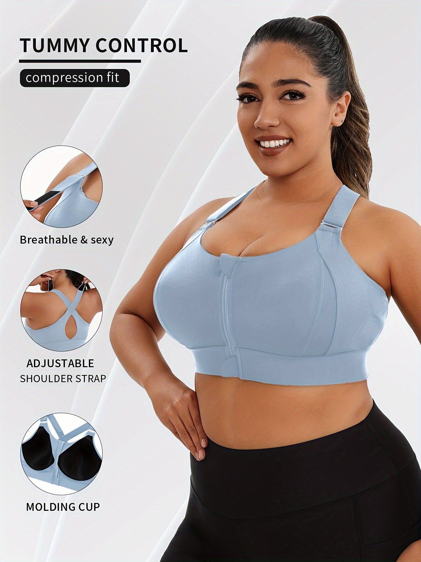 Women'S Plus Size High-Elasticity Sports Bra with Zipper - Blue, Non-Removable Padding, Adjustable Shoulder Straps, Ideal for Yoga & Pilates, Plus Size Yoga Apparel|Sleek Bralette|Comfortable Fit, Plus Size Yoga Apparel