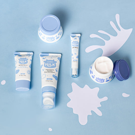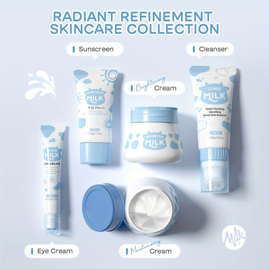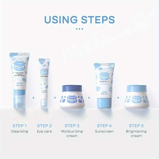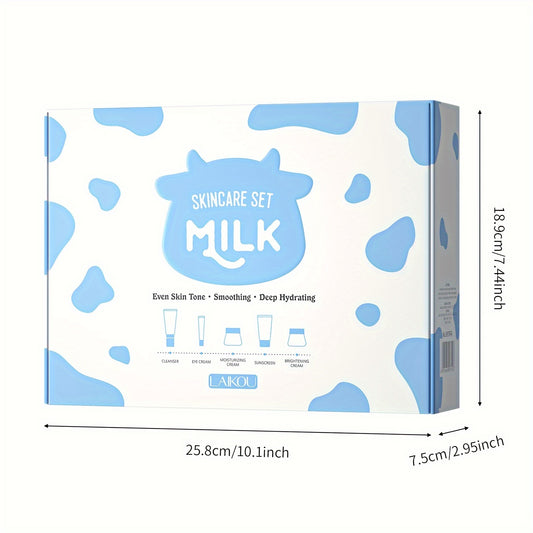 Kit de cuidados faciais LAIKOU com 5 peças à base de leite - Sabonete hidratante com escova esfoliante, creme de olhos com rolo, creme facial para todos os tipos de pele - Fórmula hidratante e de controlo da oleosidade