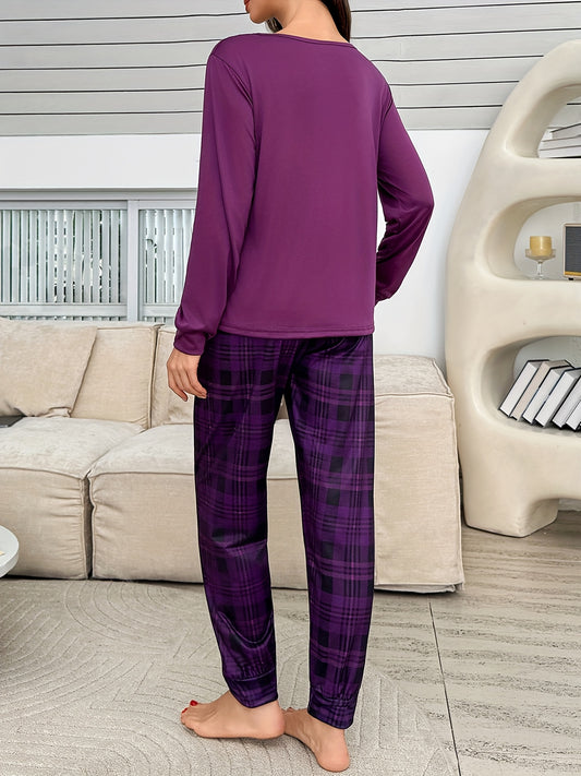 Conjunto de pijama casual para menina com estampado de corações xadrez roxo, blusa de manga comprida e calças, ideal para todas as estações.