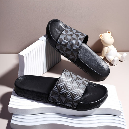 Sandálias de verão tipo slide para homem - Chinelos casuais antiderrapantes com sola macia e estampado geométrico, preto e cinzento, confortáveis para uso interior e exterior.