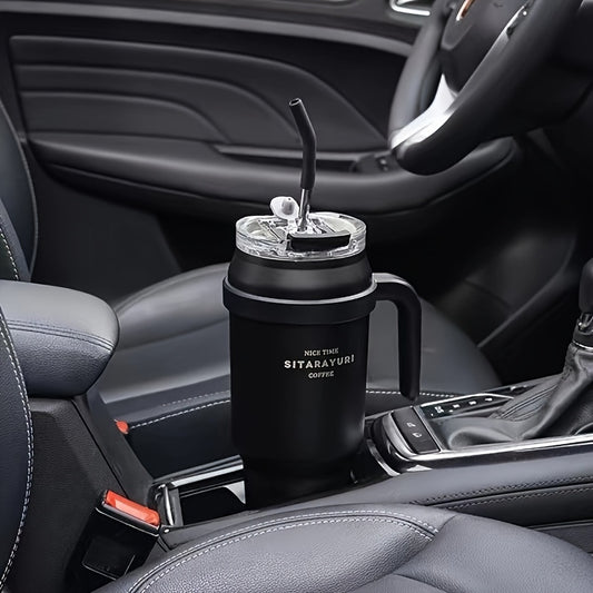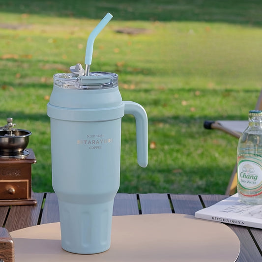 Copo térmico portátil de 1,4 litros (47,3 oz) com pega e tampa com palhinha, garrafa de água portátil de grande capacidade, copo de aço inoxidável para automóvel, ideal para desportos ao ar livre, viagens e campismo. Presente de Natal.