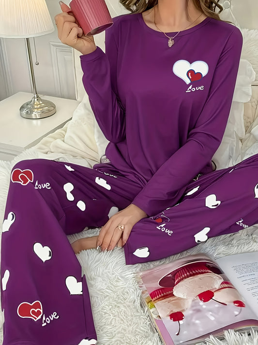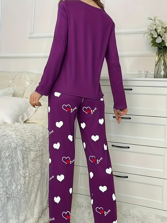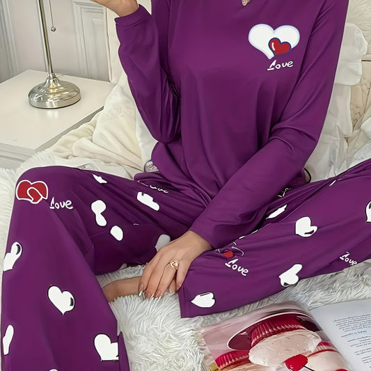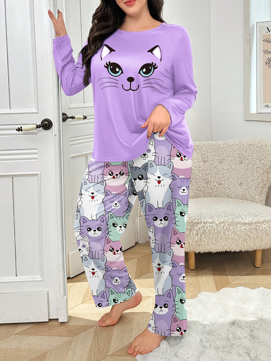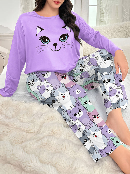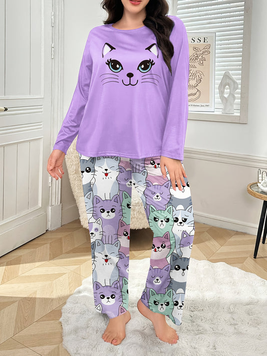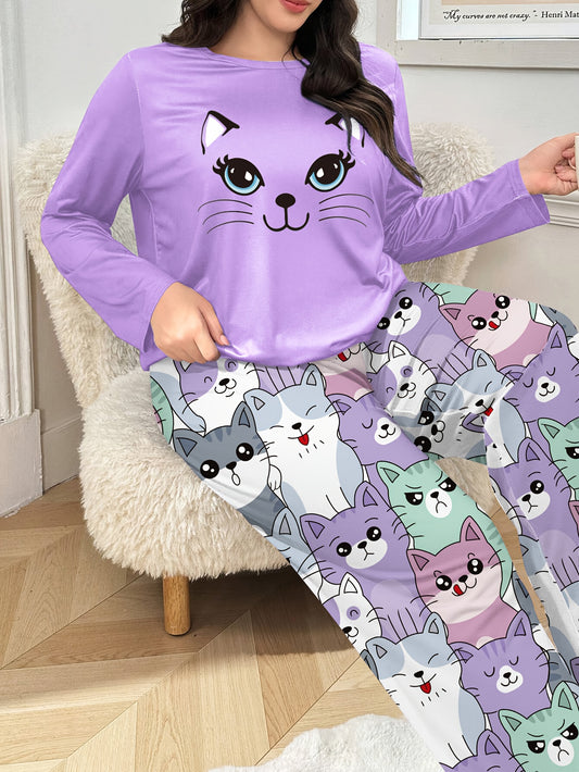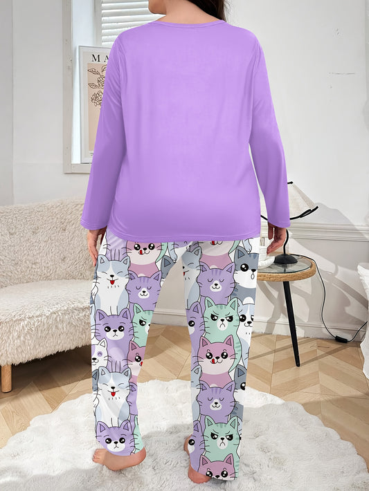 Conjunto de pijama de senhora plus size de manga comprida e estampado adorável - roxo suave, confortável para todas as estações, ideal para usar em casa no outono e no inverno.