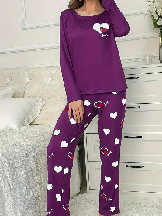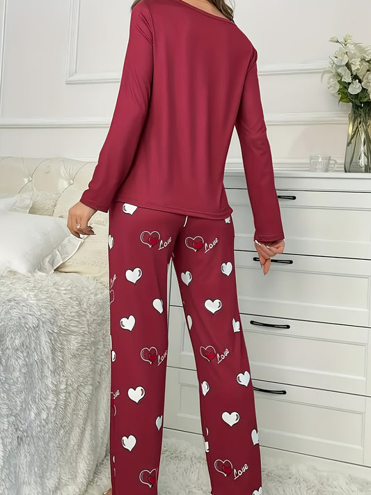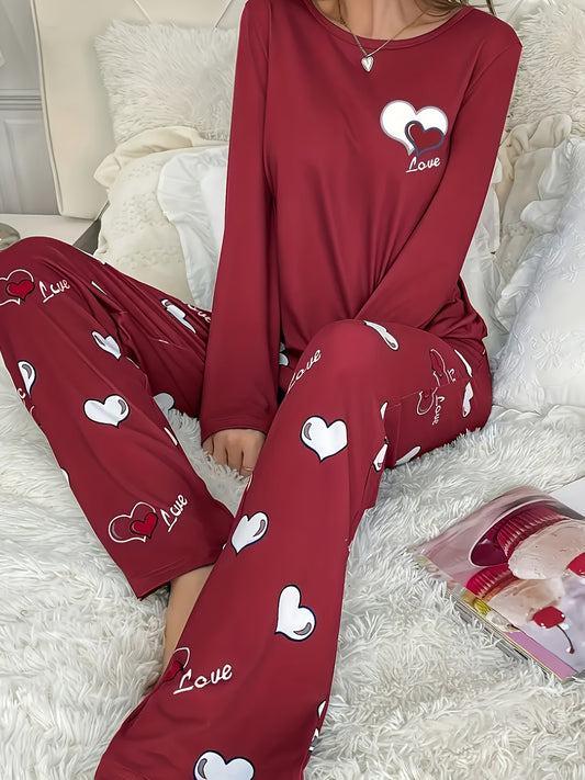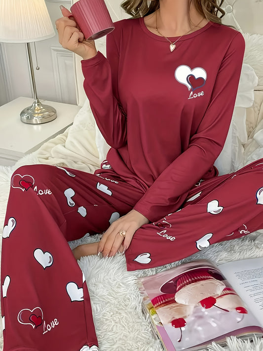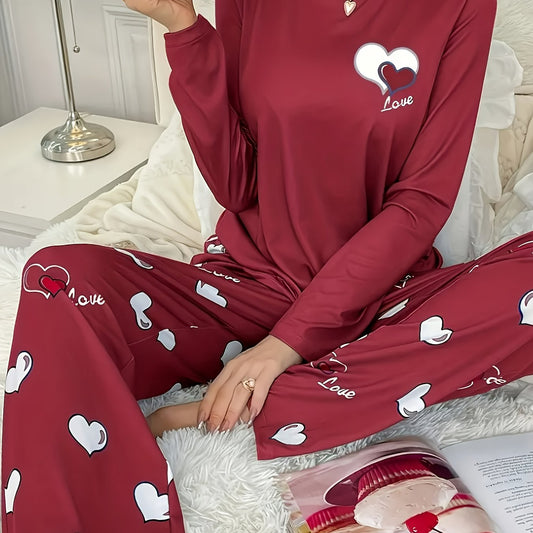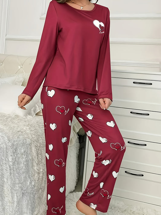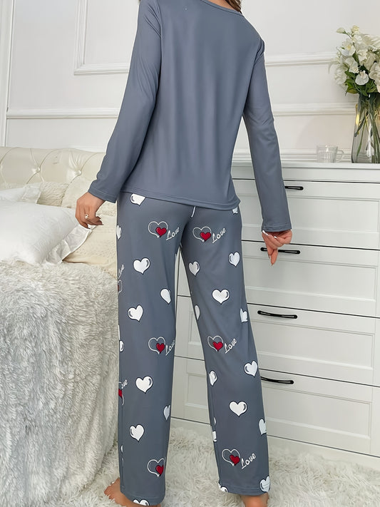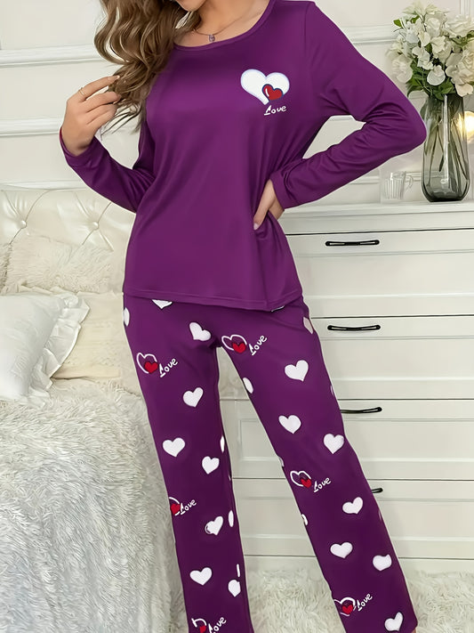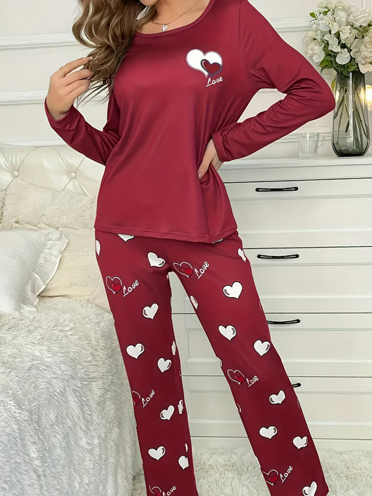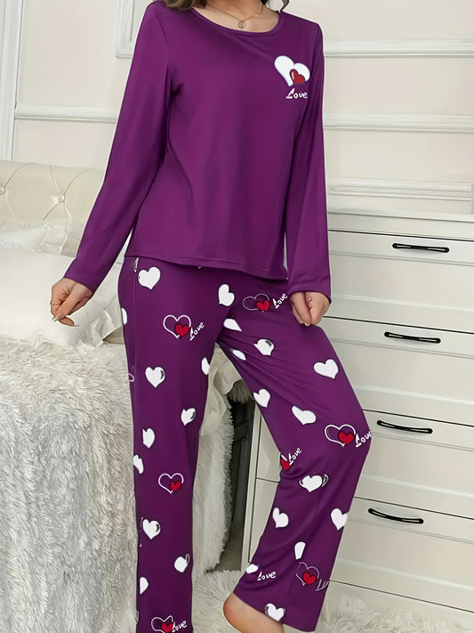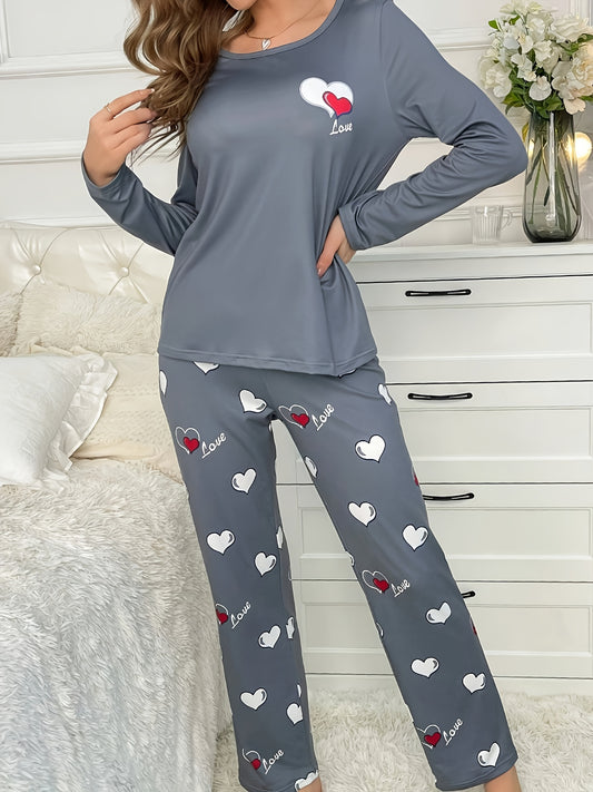 Conjunto plus size casual com estampado de corações, gola redonda e manga comprida.
