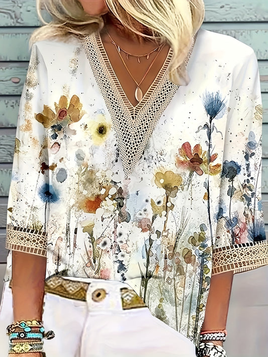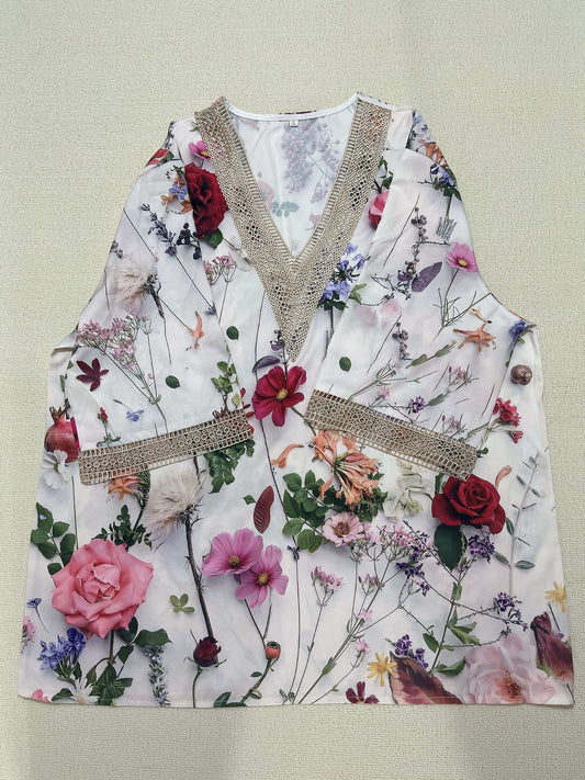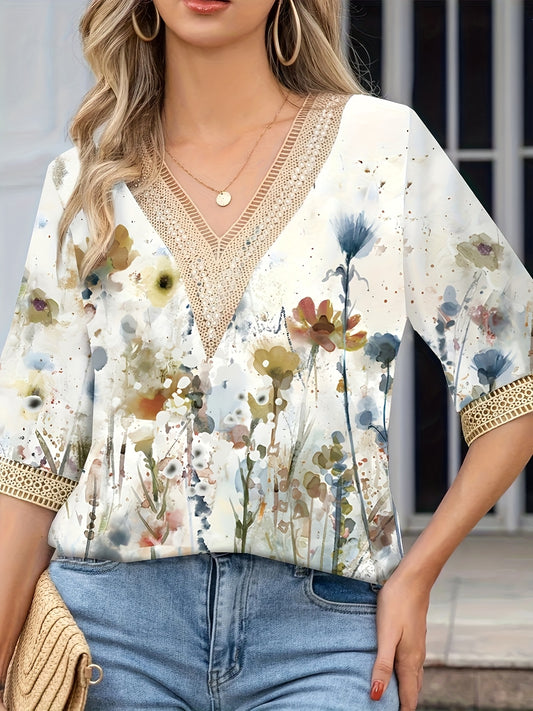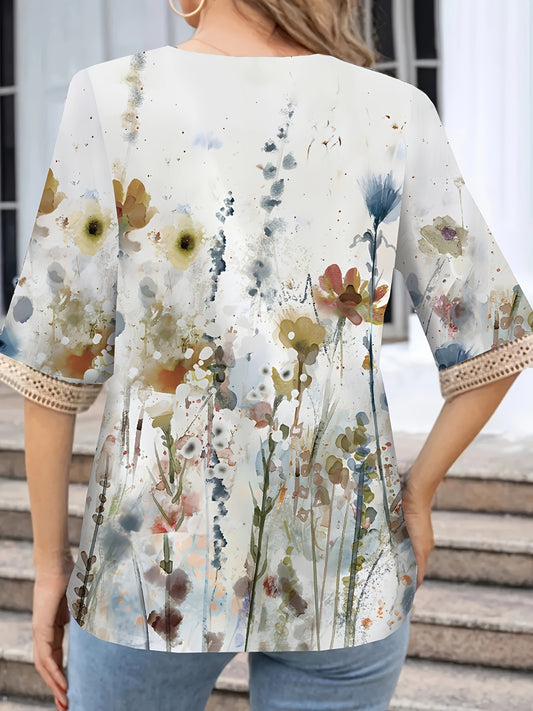 T-shirt casual plus size para mulher com estampado floral, detalhes em renda contrastante e manga curta com decote em V.