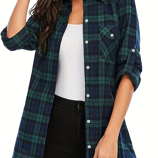 Blusa casual plus size para mulher com estampado xadrez, botões, manga comprida e gola dobrável.