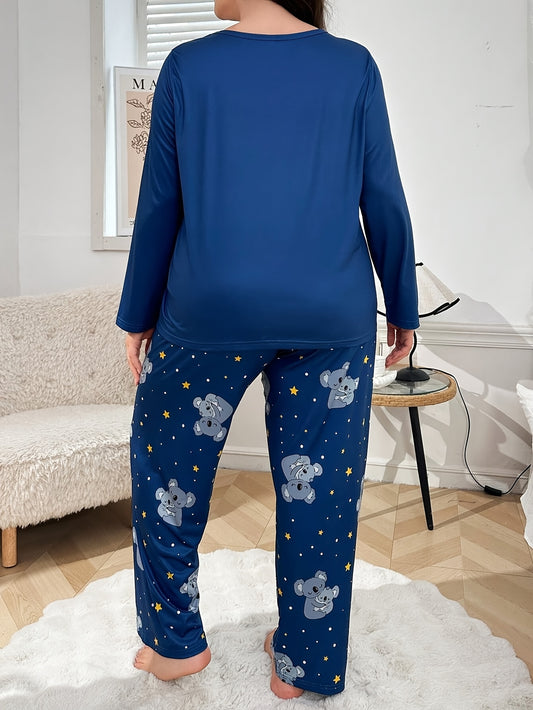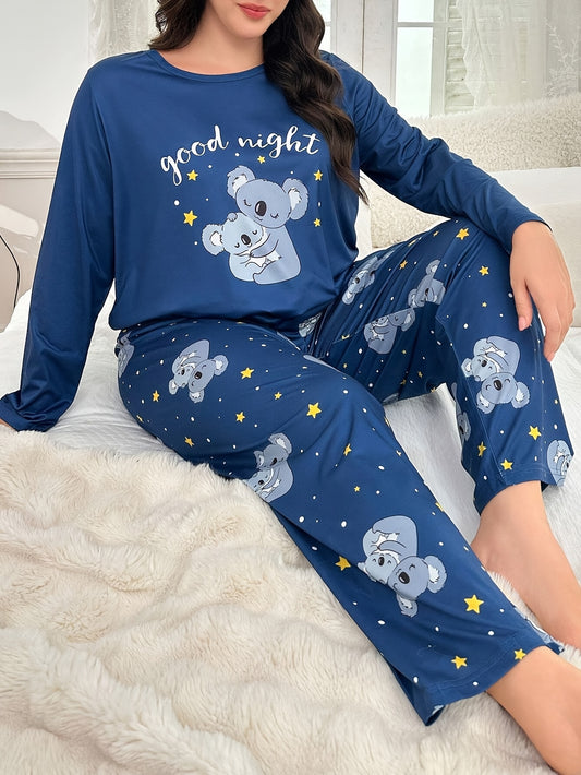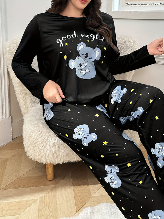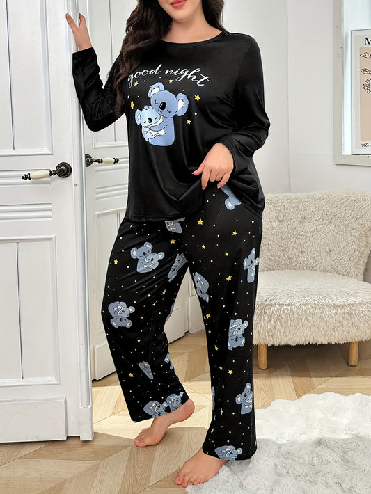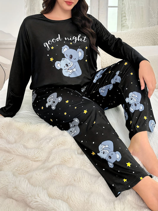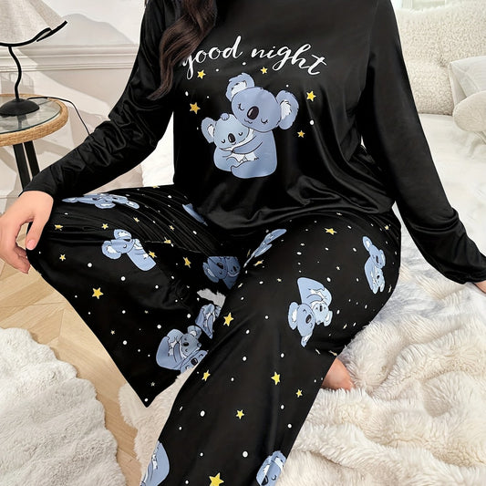 Conjunto de pijama de menina plus size para outono/inverno com estampado fofo de coala em desenho animado e mangas compridas.