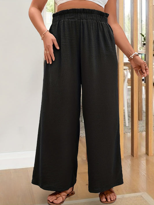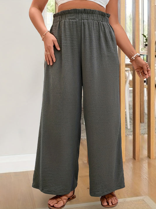 Calça casual plus size para mulher, lisa, de cintura subida, elástica, com elasticidade média e pernas largas.