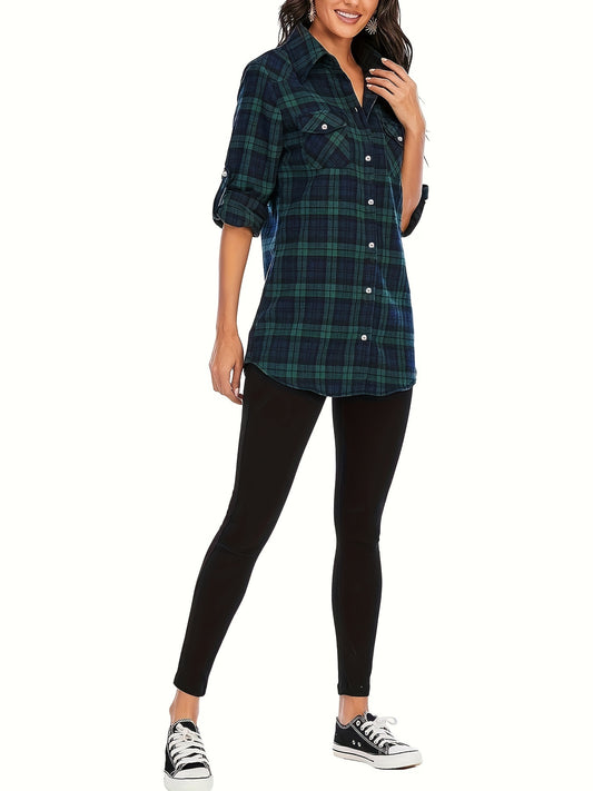 Blusa xadrez com botões e decote em V, blusa casual com mangas arregaçadas para a primavera, roupa de mulher