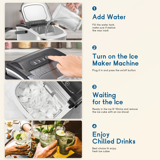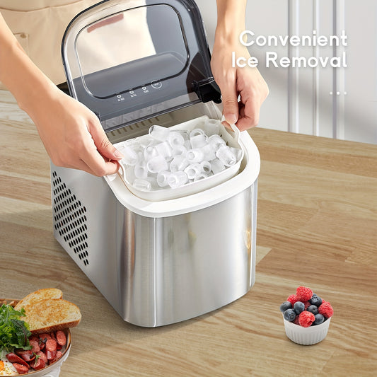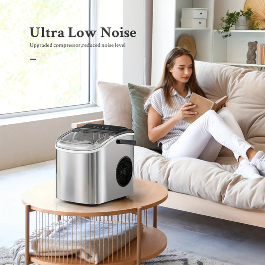 Máquina de gelo portátil, para bancada, produz 9 cubos de gelo em 6 minutos, 12 kg em 24 horas, inclui pá e cesto para gelo, ideal para casa, cozinha ou escritório, em aço inoxidável.