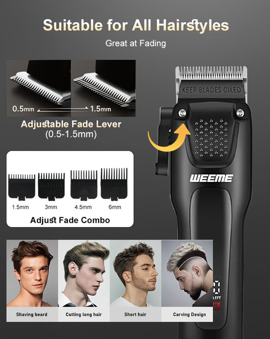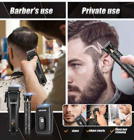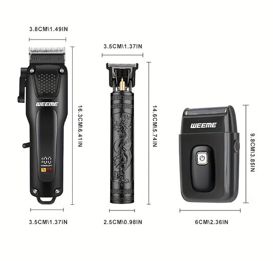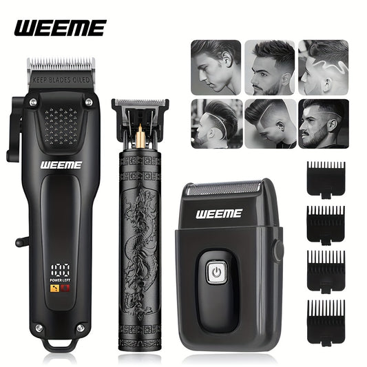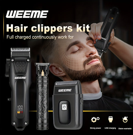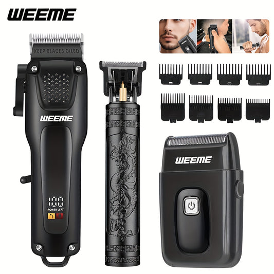 WEEME 3pcs Men's Grooming Kit - LCD Electric Clipper + Cordless Shaver + T-Blade Trimmer | USB-C Rechargeable w/Brushes & Care Accessories | Durable Hair/Facial Grooming Tools for Home & Travel