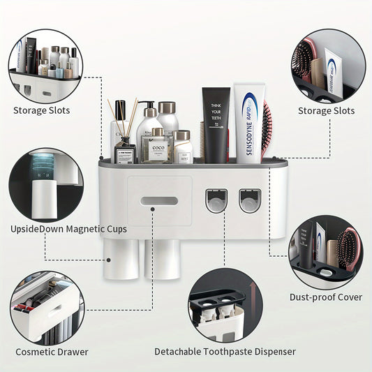 Suporte de parede para escova de dentes com dispensador automático - 6 compartimentos, copos magnéticos, gaveta para cosméticos e tabuleiro organizador - Organizador de casa de banho elegante em preto