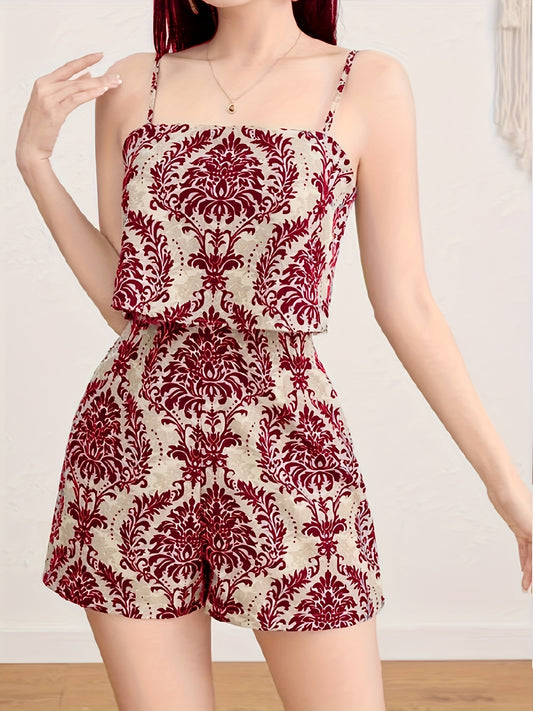 Women's Elegant Portrait Print V-Neck Sleeveless Jumpsuit - Loose Fit Button-Front Shorts Romper with Adjustable Waist Tie, Machine Washable Casual Outfit for Spring Summer Fall, Vacation Clothing, Lightweight Fabric, Trendy