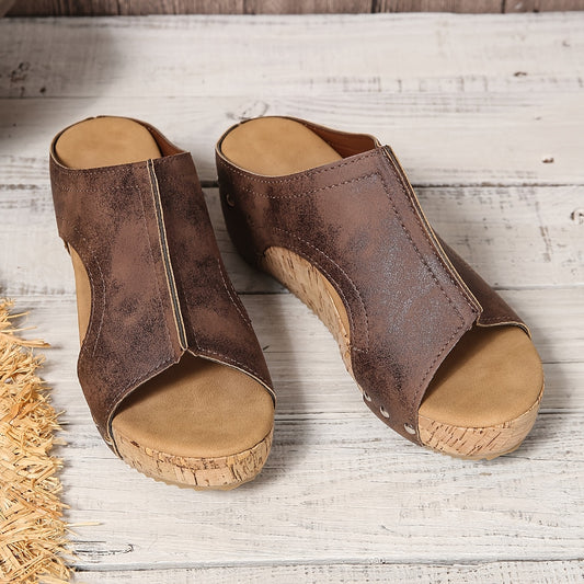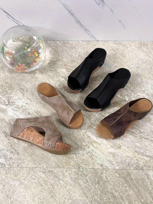 Sandálias de mulher de estilo vintage com salto baixo, modelo slip-on de cor sólida com bico aberto e detalhe de rebite, confortáveis para todas as estações, sola sintética, materiais artificiais - Calçado da moda para o verão