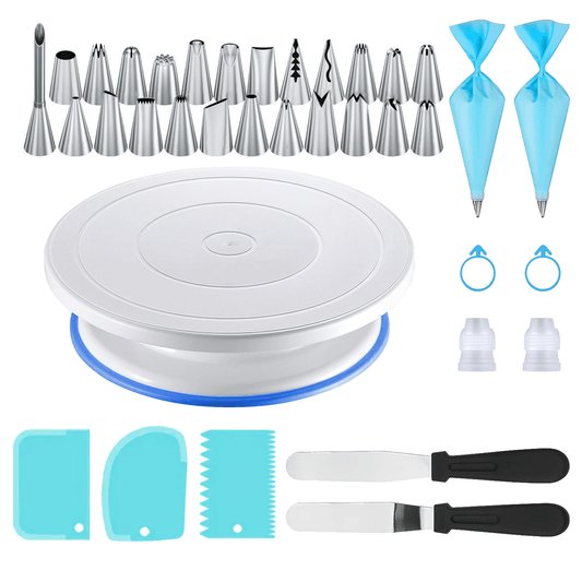 36pcs Stainless Steel Piping Nozzles Cake Turntable Set, 24 Piping Nozzles, 1 Cake Turntable, 2 Reusable Piping Bags, 2 Silicone Rings, 2 Converters, 2 Cream Spatulas, 3 Cream Scrapers, Cake Decorating, Nozzles, Pastry, Cupca