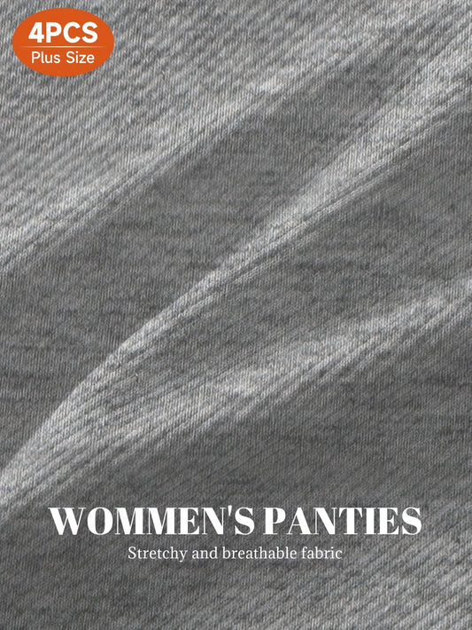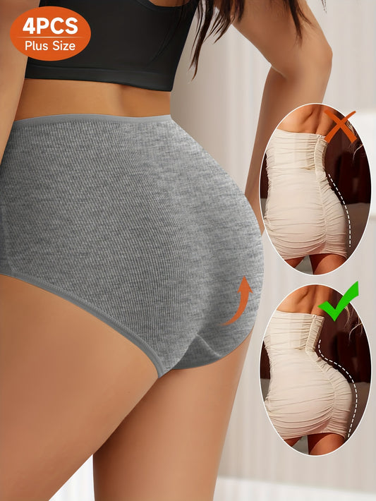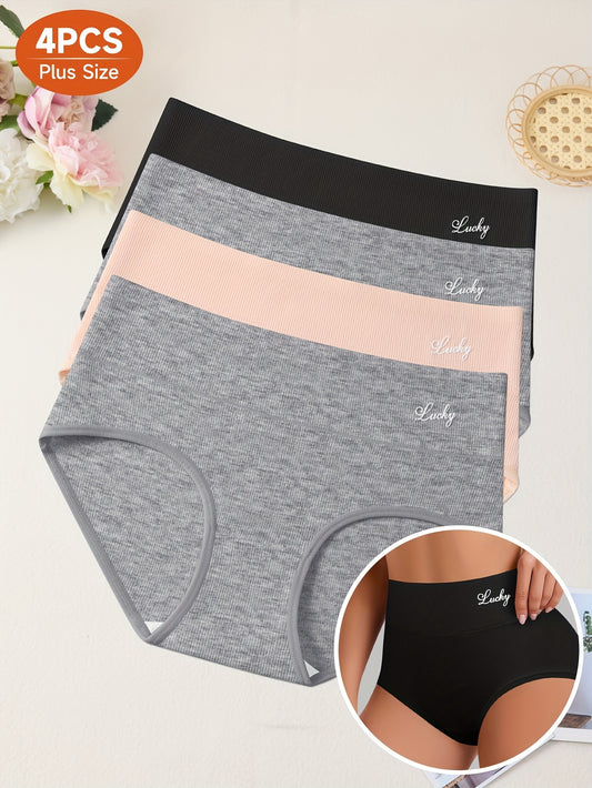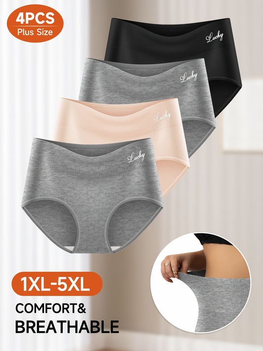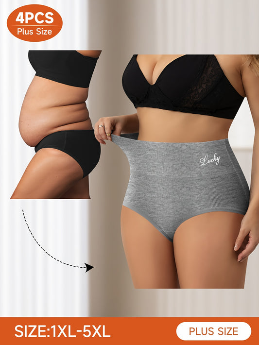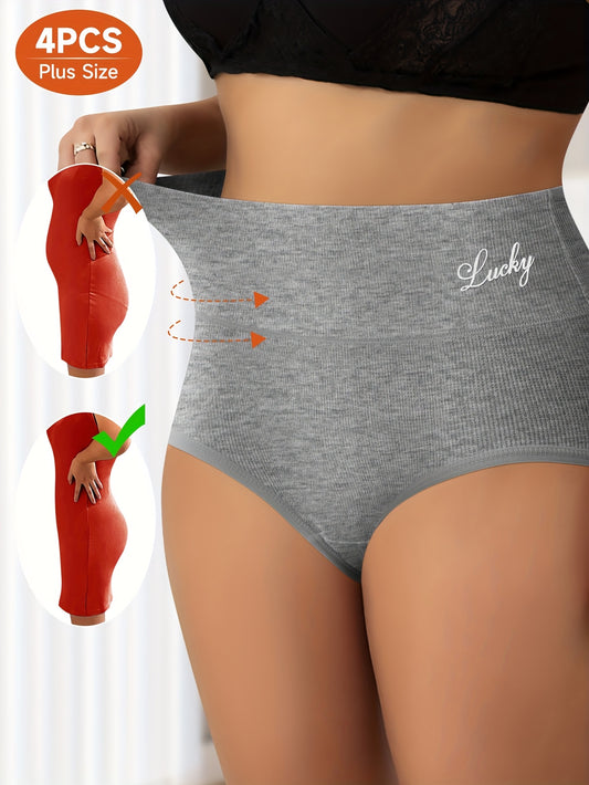 4pcs Plus Size Women'S High-Waist Shapewear Briefs - Breathable, Non-Slip, No-Slip, No-Roll, Comfort Fit with "Lucky" Design, Solid Color & Striped Patterns, High Elasticity Fabric for All-Day Comfort, High Waisted Underwear,