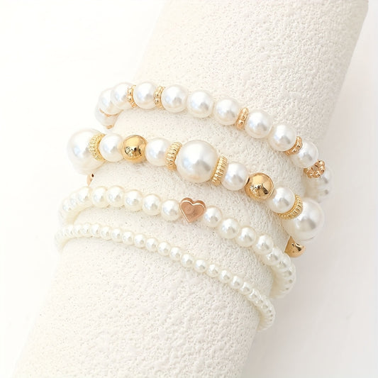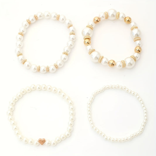 4pcs Set Real-Looking Faux Imitation Pearl Bracelet & Necklace-like Bead Set (No Coating) - White & Imitation Pearl with Golden-Tone Caps, Matching Large Beads - Wedding, Party, Daily Wear - Luxury Year-Round Collection for W