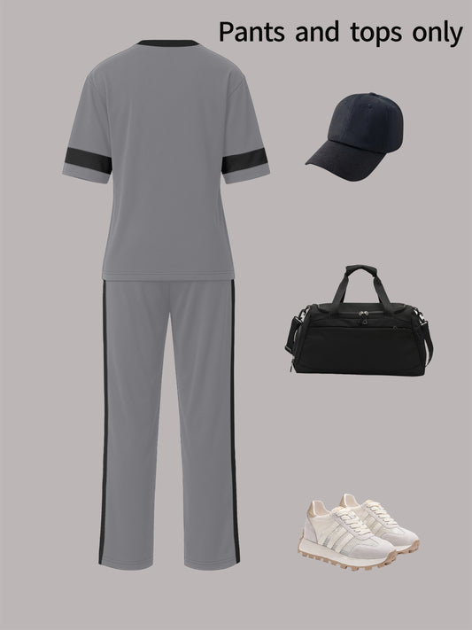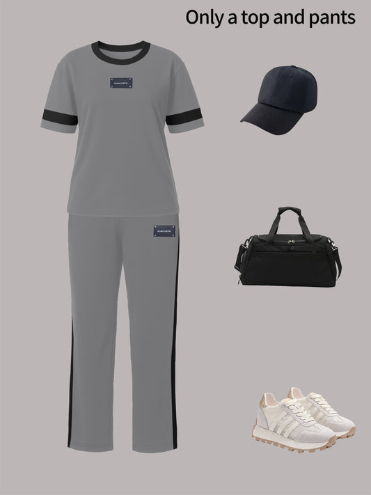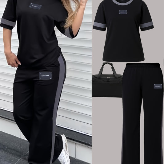 Tendência de moda outono: Conjunto de duas peças para menina composto por t-shirt de manga curta com gola redonda e blocos de cor + calças direitas casuais com cintura elástica e corte largo.