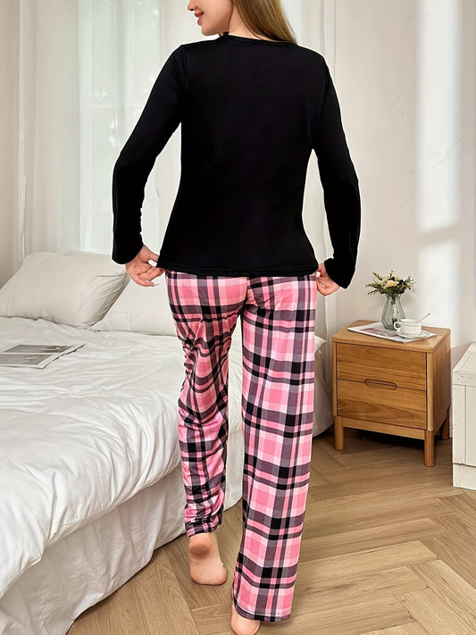 Conjunto de pijama para menina para o outono e inverno com mangas compridas, calças e estampado xadrez de corações e letras em estilo cartoon.