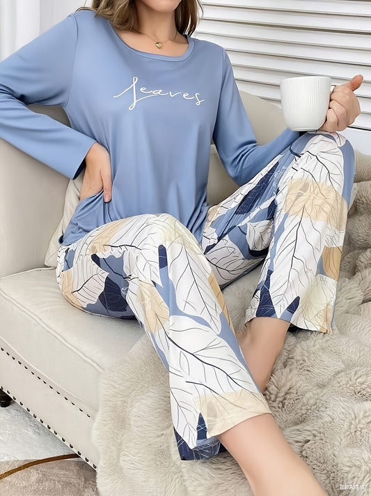 Conjunto de pijama casual, versátil e elegante para mulher com estampado de letras, blusa de manga comprida com gola redonda e calças com estampado floral para o outono e inverno.