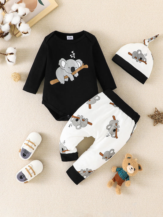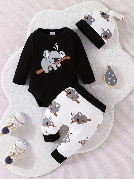 Conjunto de body de manga comprida, calças e gorro para bebé menino em algodão com estampado de coala a dormir super giro. Roupa para recém-nascido.