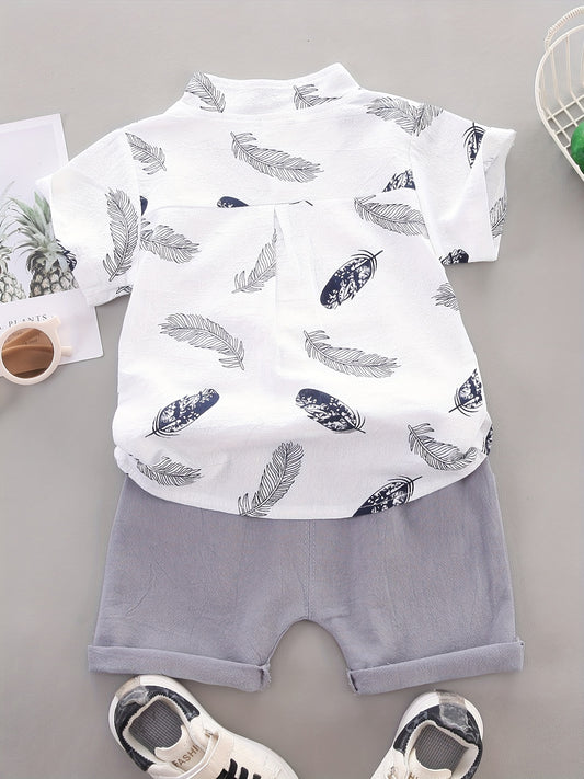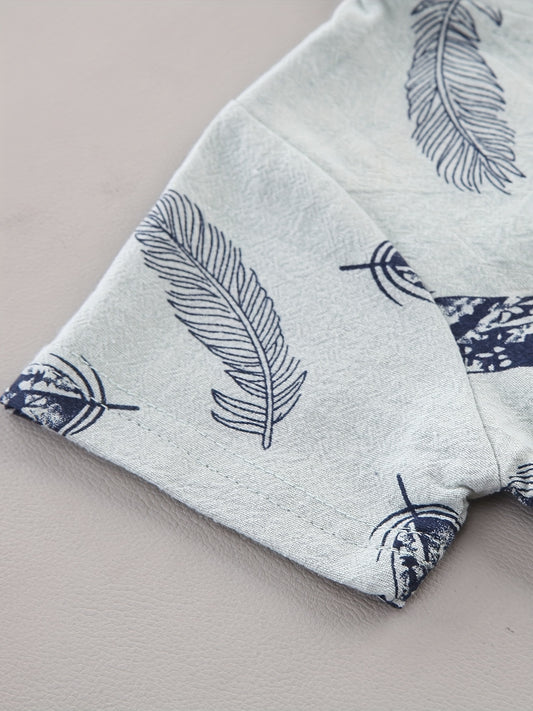 Conjunto casual para bebé menino - Camisola de manga curta e calções com estampado de penas - Conjunto infantil de 2 peças para atividades ao ar livre