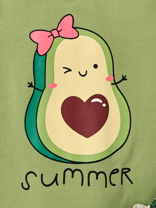 Conjunto de Roupa Infantil para Bebé Menina com Estampado de Abacate: Macacão, Calções e Fita para o Cabelo - 3 Peças - Ideal para o Verão e Atividades ao Ar Livre