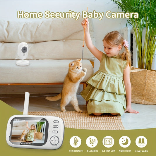 Babyphone com ecrã LCD de 8,89 cm e resolução 720p, alcance de transmissão sem fios de 274,32 metros, visão noturna automática, chamadas de áudio bidirecionais, sensor de temperatura, 8 canções de embalar e editor integrado. Design compacto e portátil.
