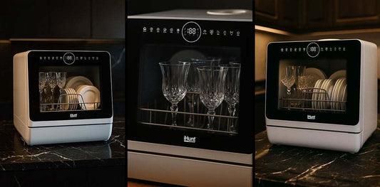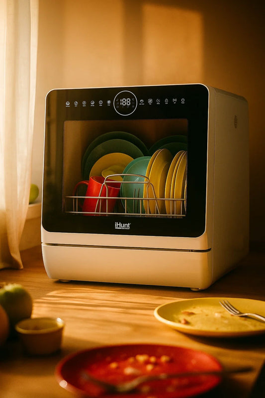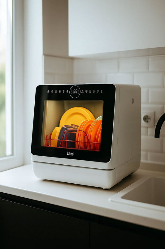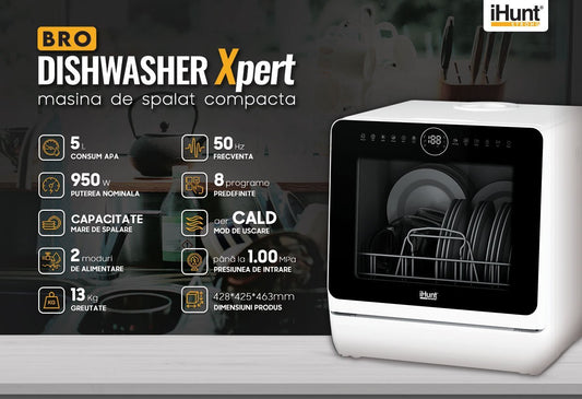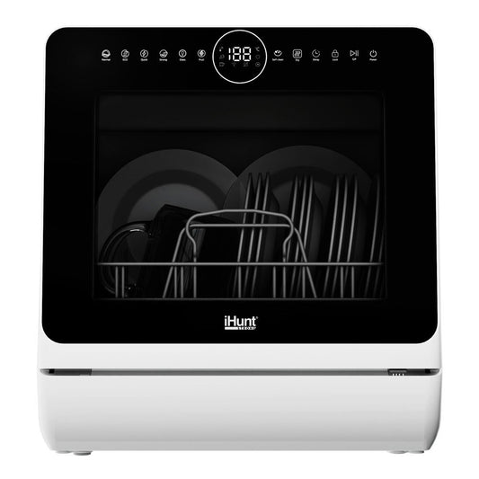 Máquina de lavar loiça compacta Ihunt Bro Xpert, Turbo Clean, 950W, com bomba de drenagem, controlo digital, classe B, 6 programas, aquecimento/secagem, torneira de abastecimento de água/manual, depósito de água de 5L, 45cm, branco