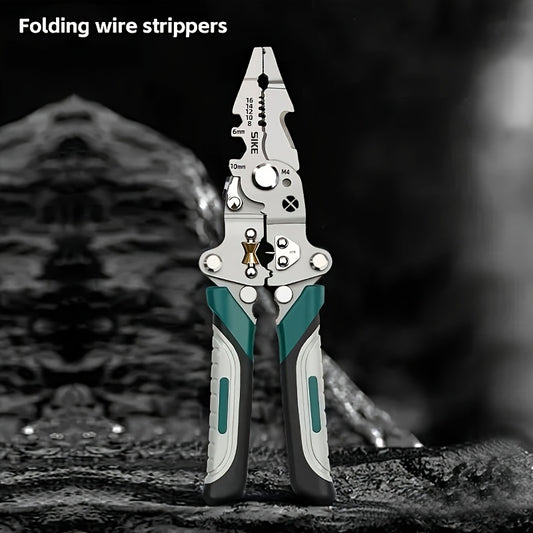 Alicate decapador de fios multifuncional dobrável de nível industrial para eletricistas, ferramenta de precisão durável em aço carbono de alta resistência para cortar, cravar e decapar fios - adequado para todos os trabalhos elétricos.