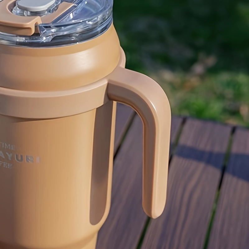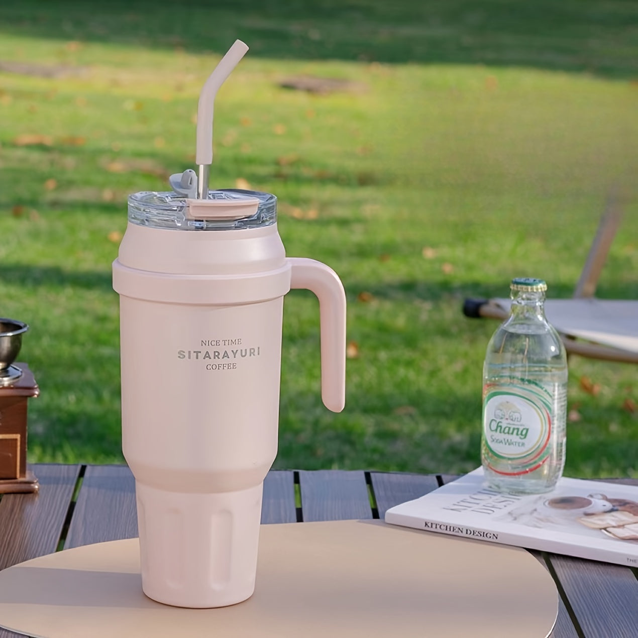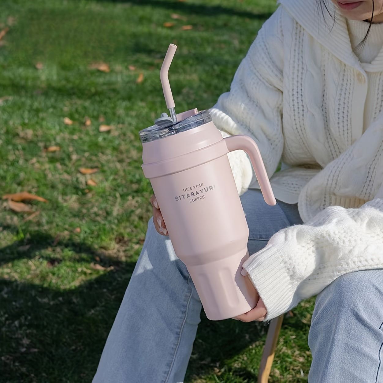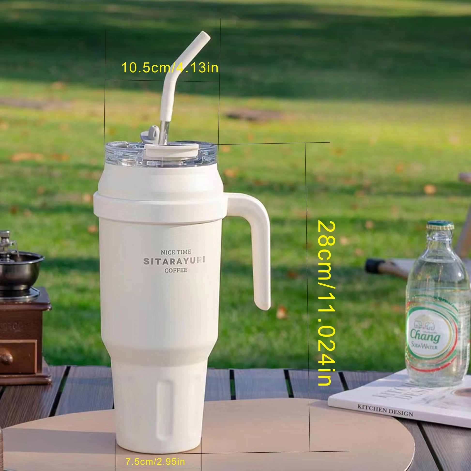 Copo térmico portátil de 1,4 litros (47,3 oz) com pega e tampa com palhinha, garrafa de água portátil de grande capacidade, copo de aço inoxidável para automóvel, ideal para desportos ao ar livre, viagens e campismo. Presente de Natal.