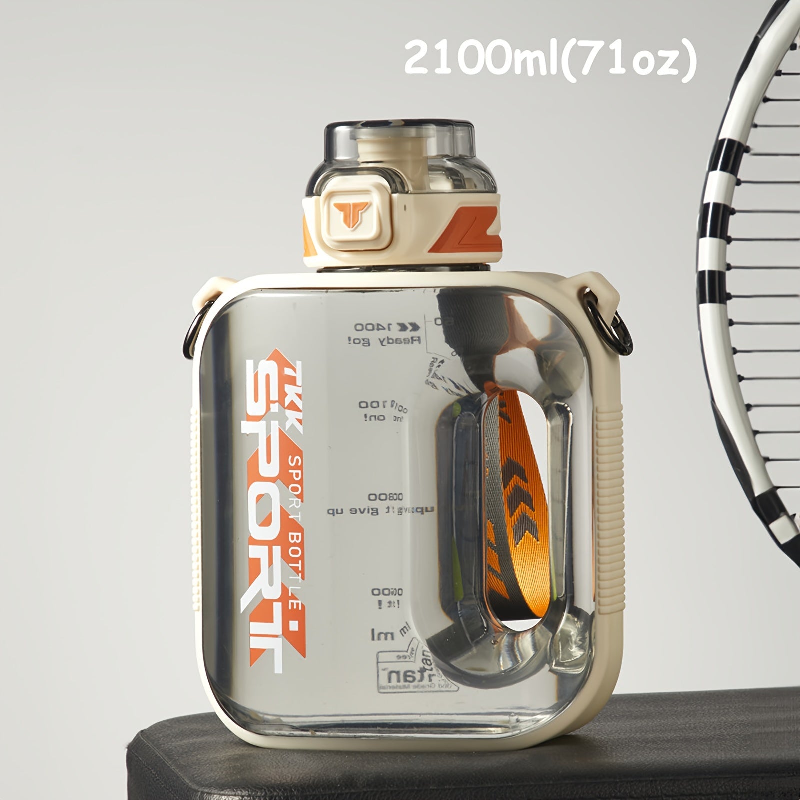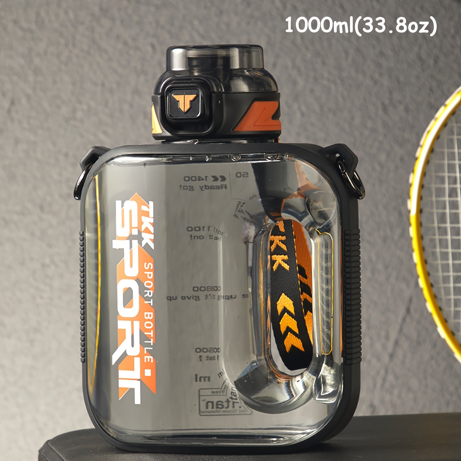 Garrafa de água de plástico com estampado de letras TKK, garrafa desportiva à prova de fugas com alça e alça de ombro, portátil para exercício e viagens.
