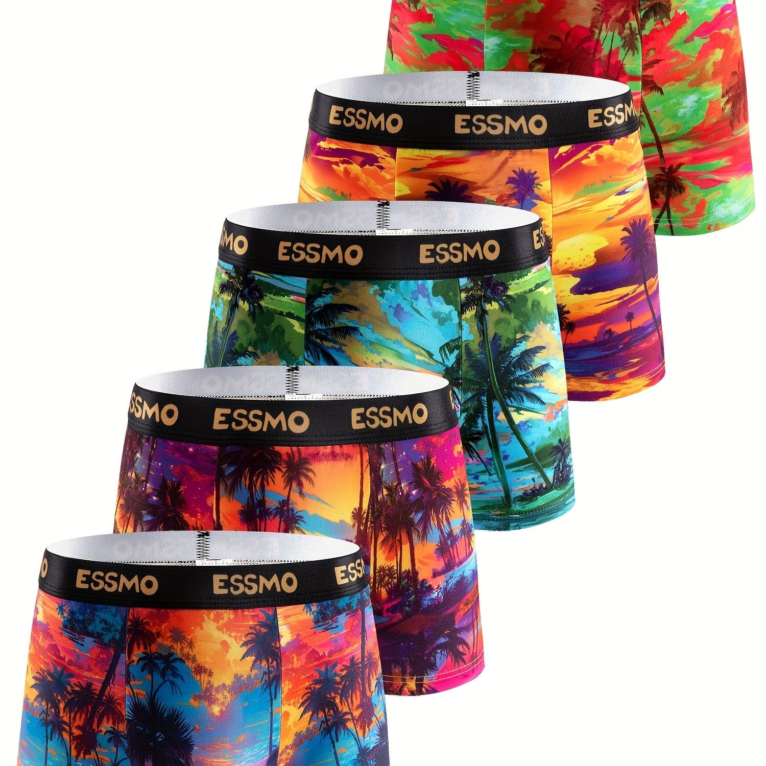 5pcs ESSMO Men'S Light Luxury Boxer Briefs - Vibrant Tropical Sunset & Palm Tree Design, Medium Stretch Fabric, Comfortable & Stylish Underwear, Relaxed Fit Boxers|Tropical Print Boxers|Stretchable Fabric