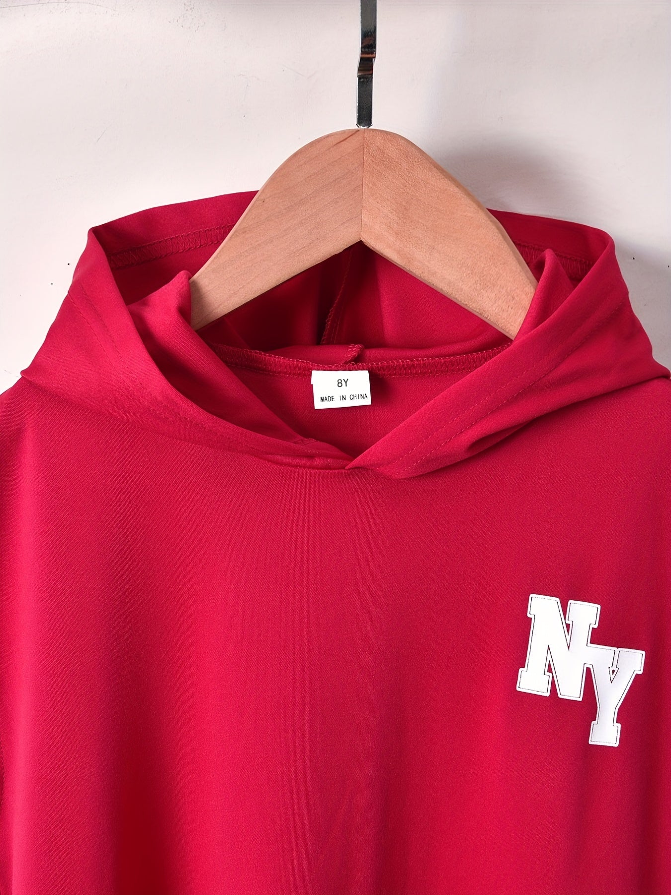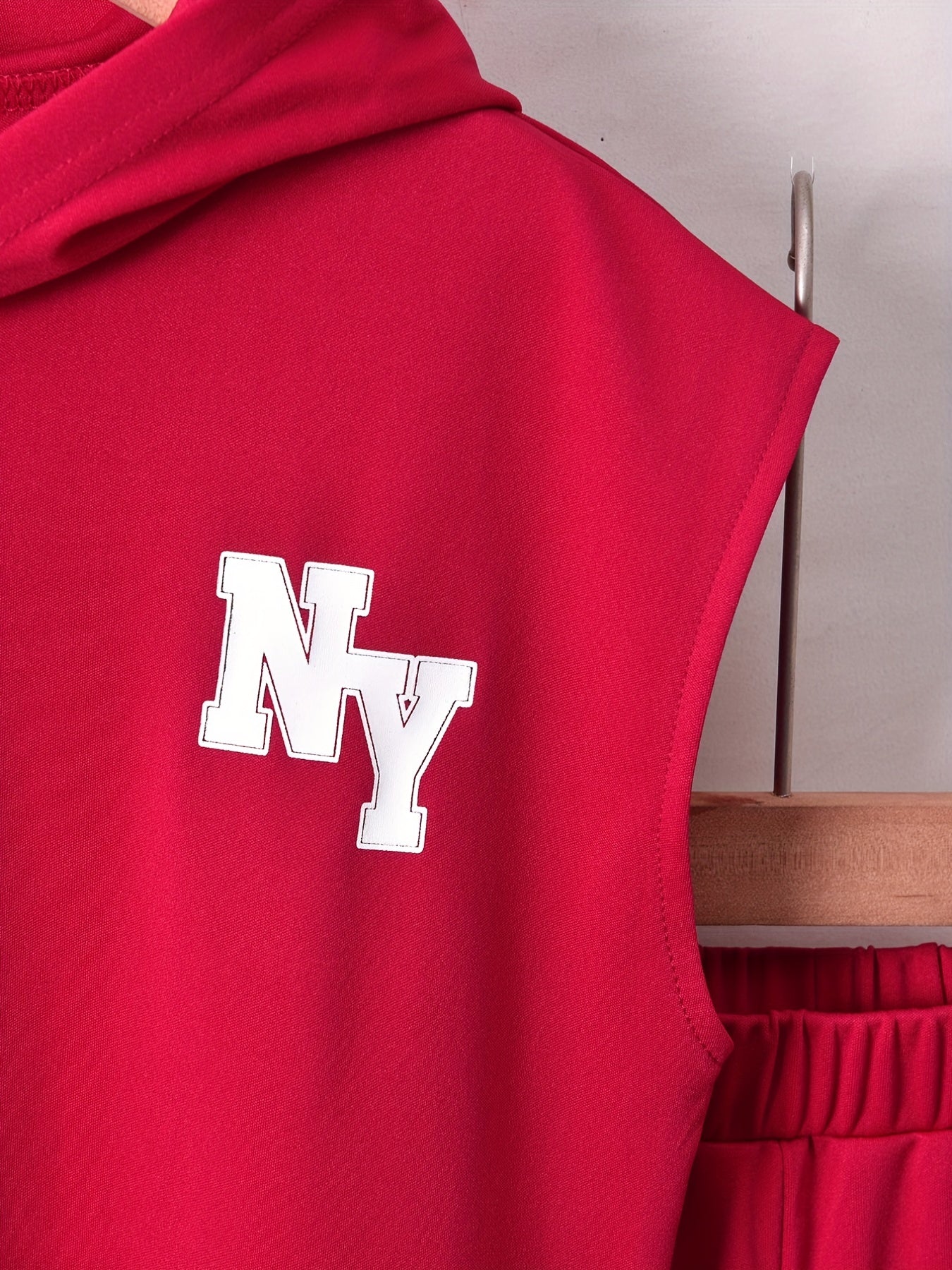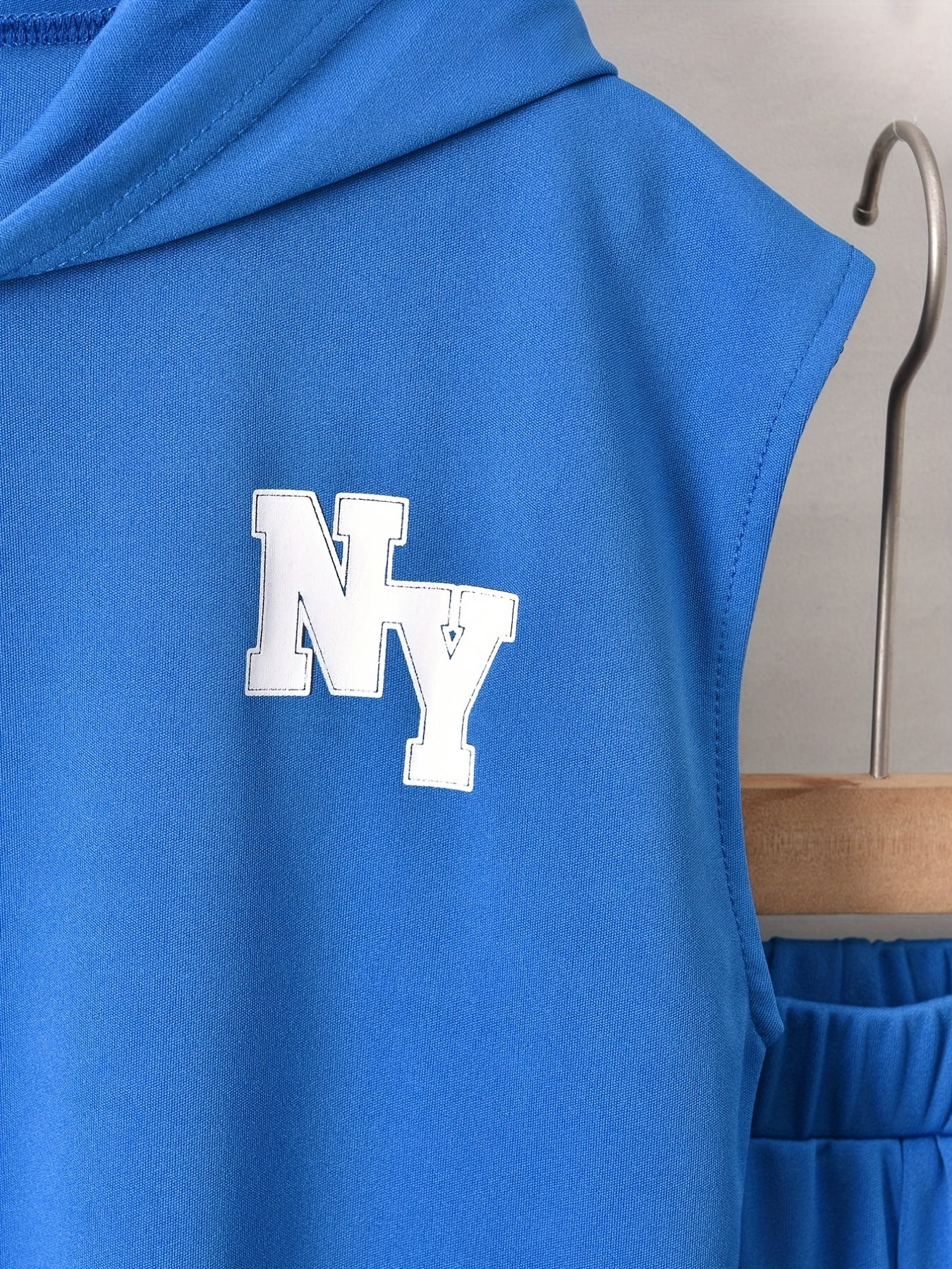 Conjunto elegante de t-shirt de manga curta com estampado de letras e calções para menino, ideal para atividades ao ar livre.