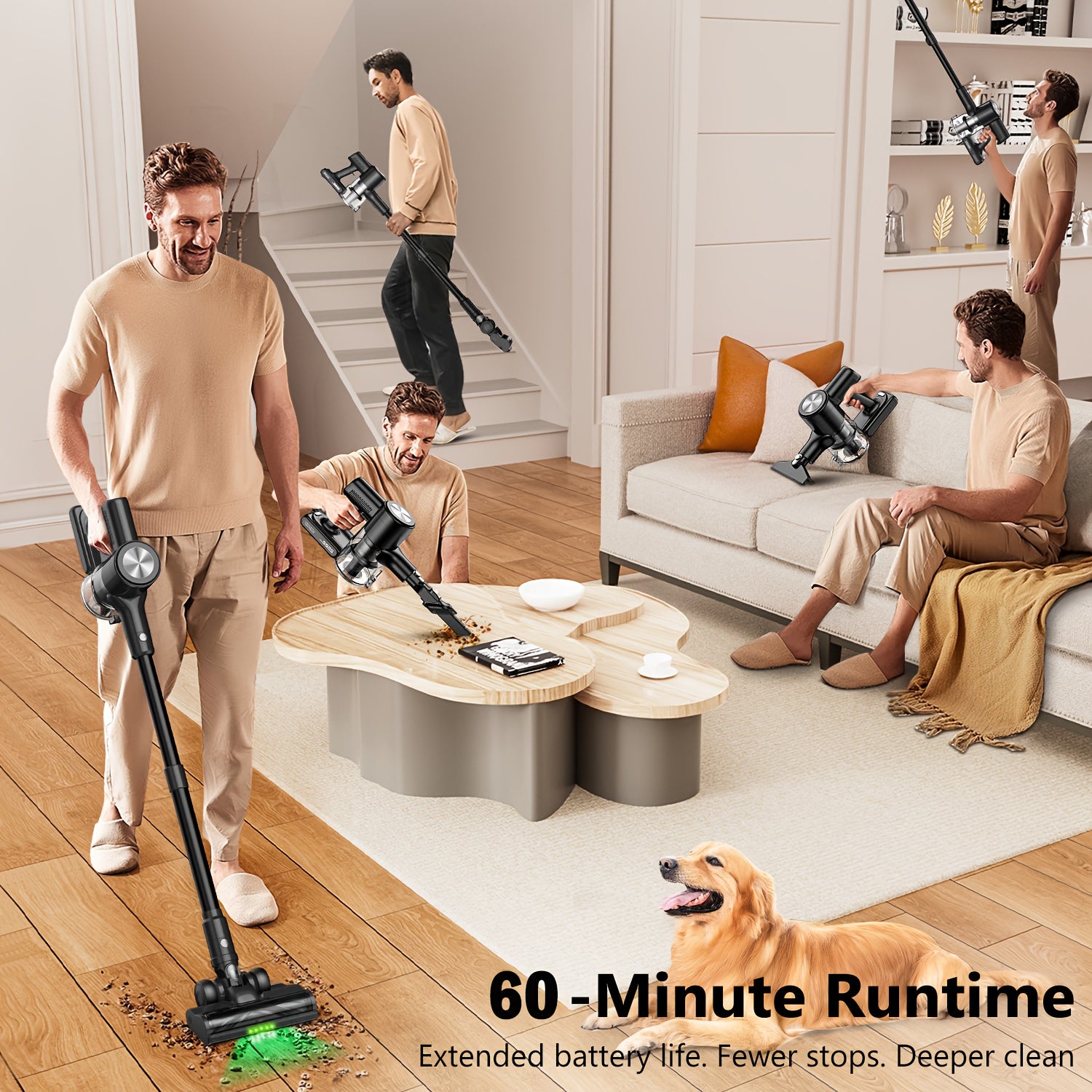 Aspirador sem fios, leve e potente, com autonomia de 60 minutos, autossustentável, com base de carregamento, luz verde melhorada e escova anti-emaranhamento para pavimentos, ideal para pelos de animais, carpetes e pavimentos.