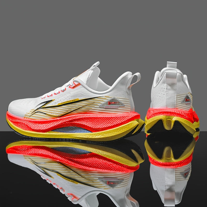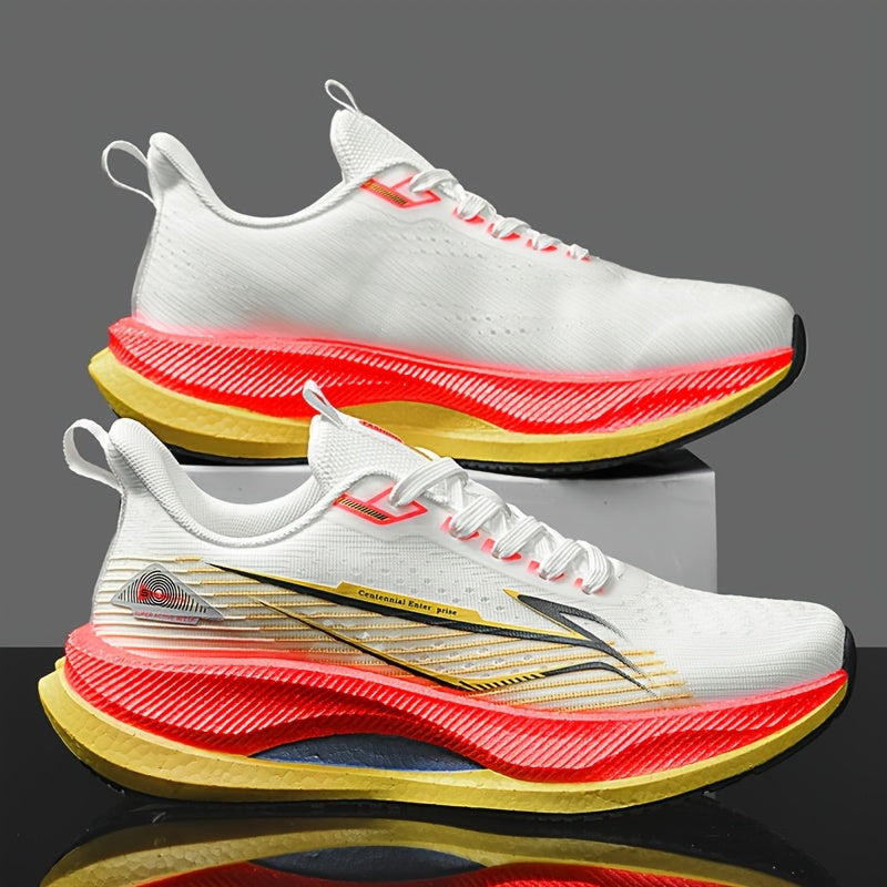 Men's All-Season Running Shoes - Breathable Knit Gym Sneakers with Cushioned MD Sole, Non-Slip Grip - Lightweight Sneakers for Marathon, Training, Everyday - White/Green/Orange Accent - Lace-Up Closure, Marathon Footwear, Geo