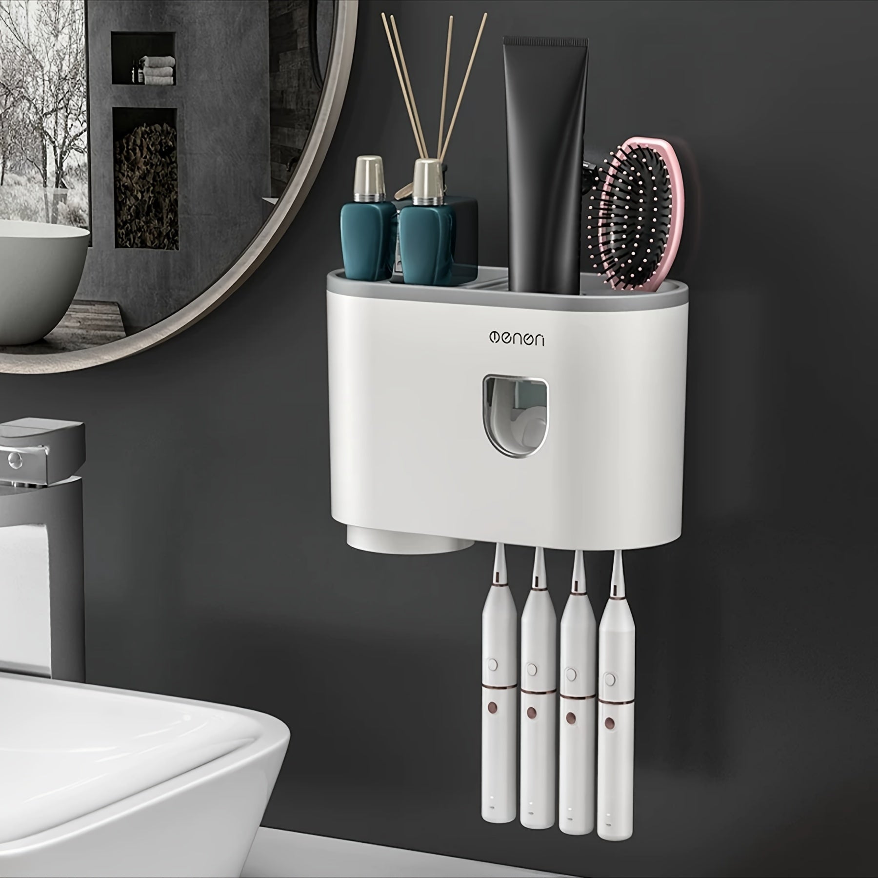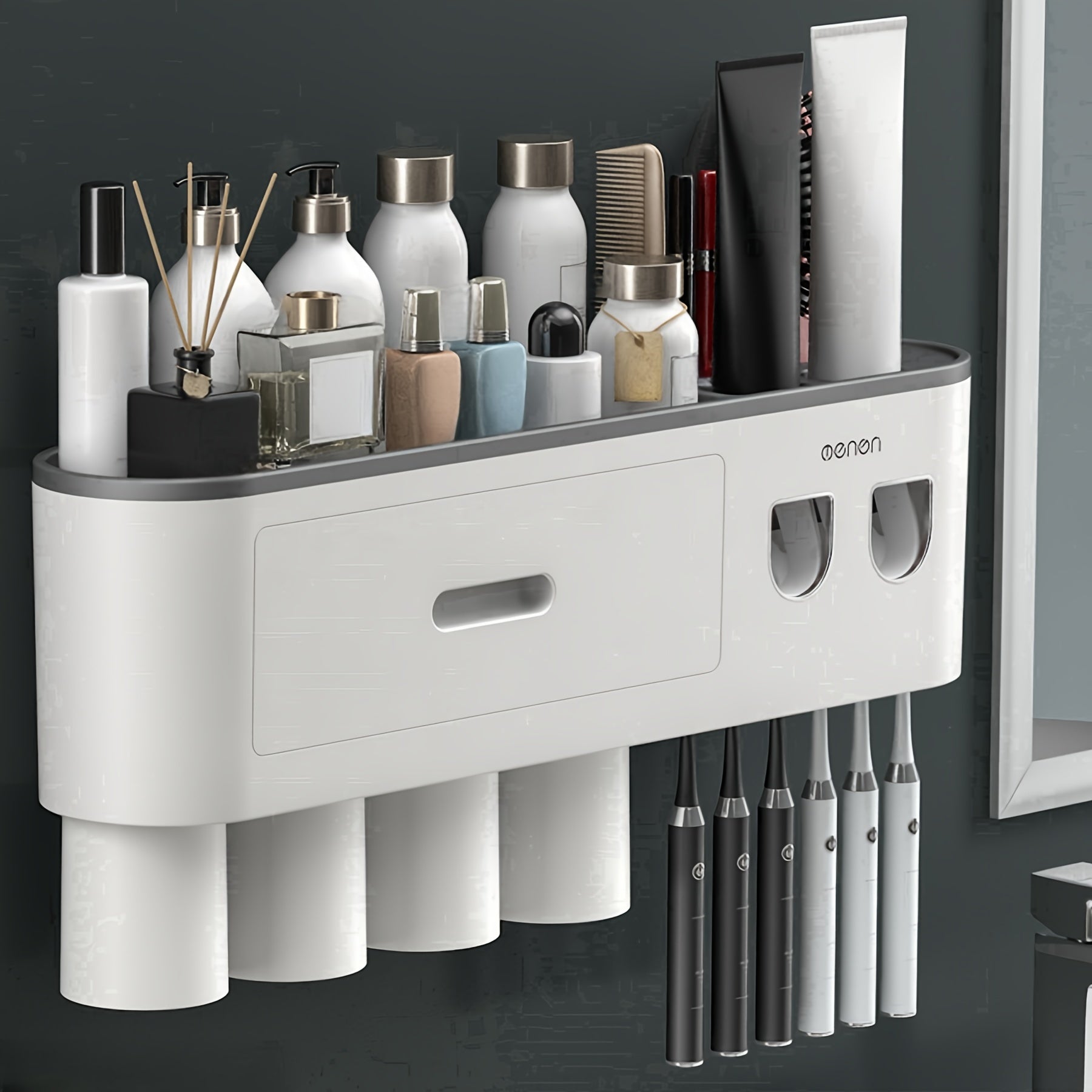No Drill Adhesive Wall-Mounted Modern White Bathroom Organizer Set with 2-in-1 Magnetic Toothpaste Dispenser & Multi-Tier Storage Shelf - Space-Saving Over Sink Organizer with Suction Cup Hooks, Durable Plastic Construction f