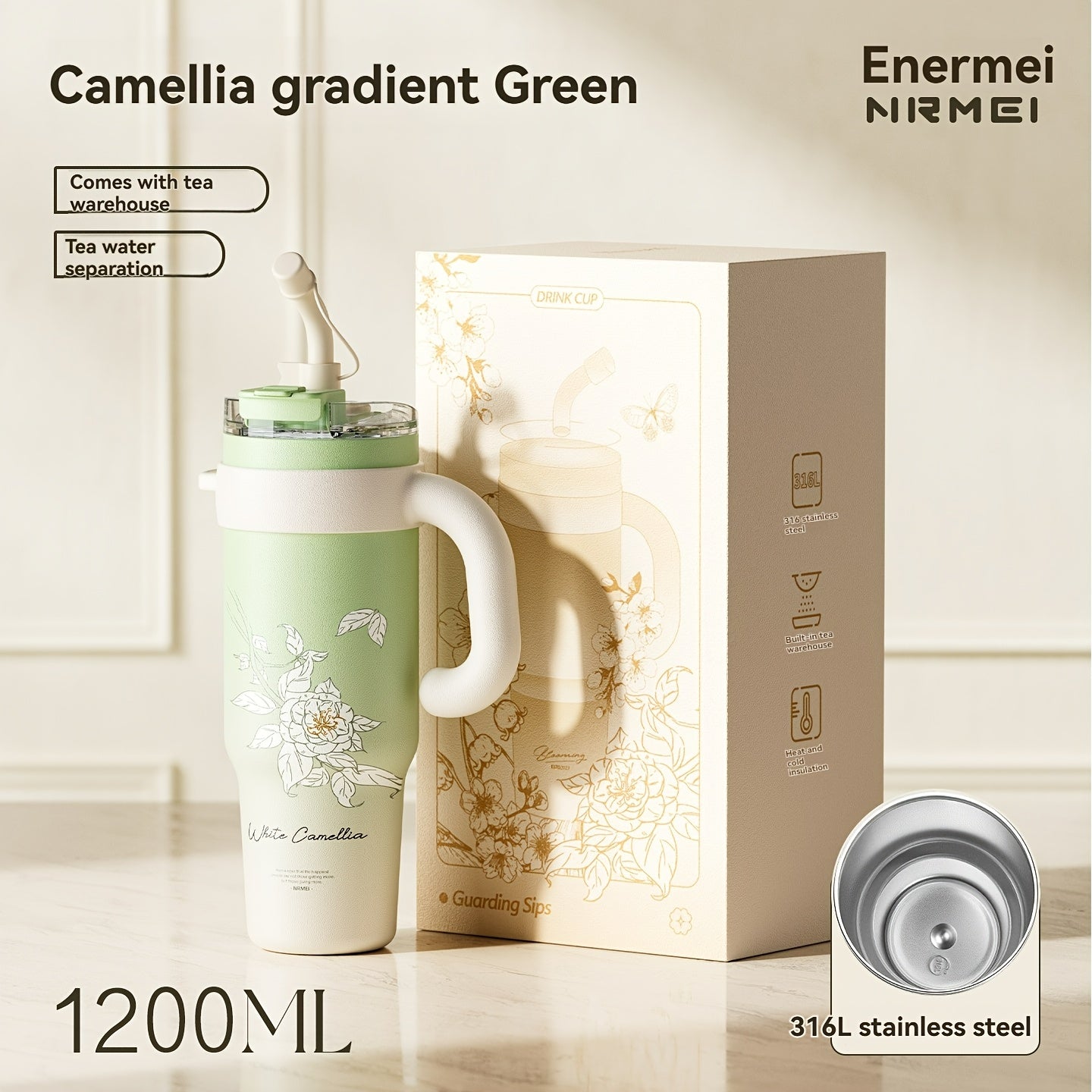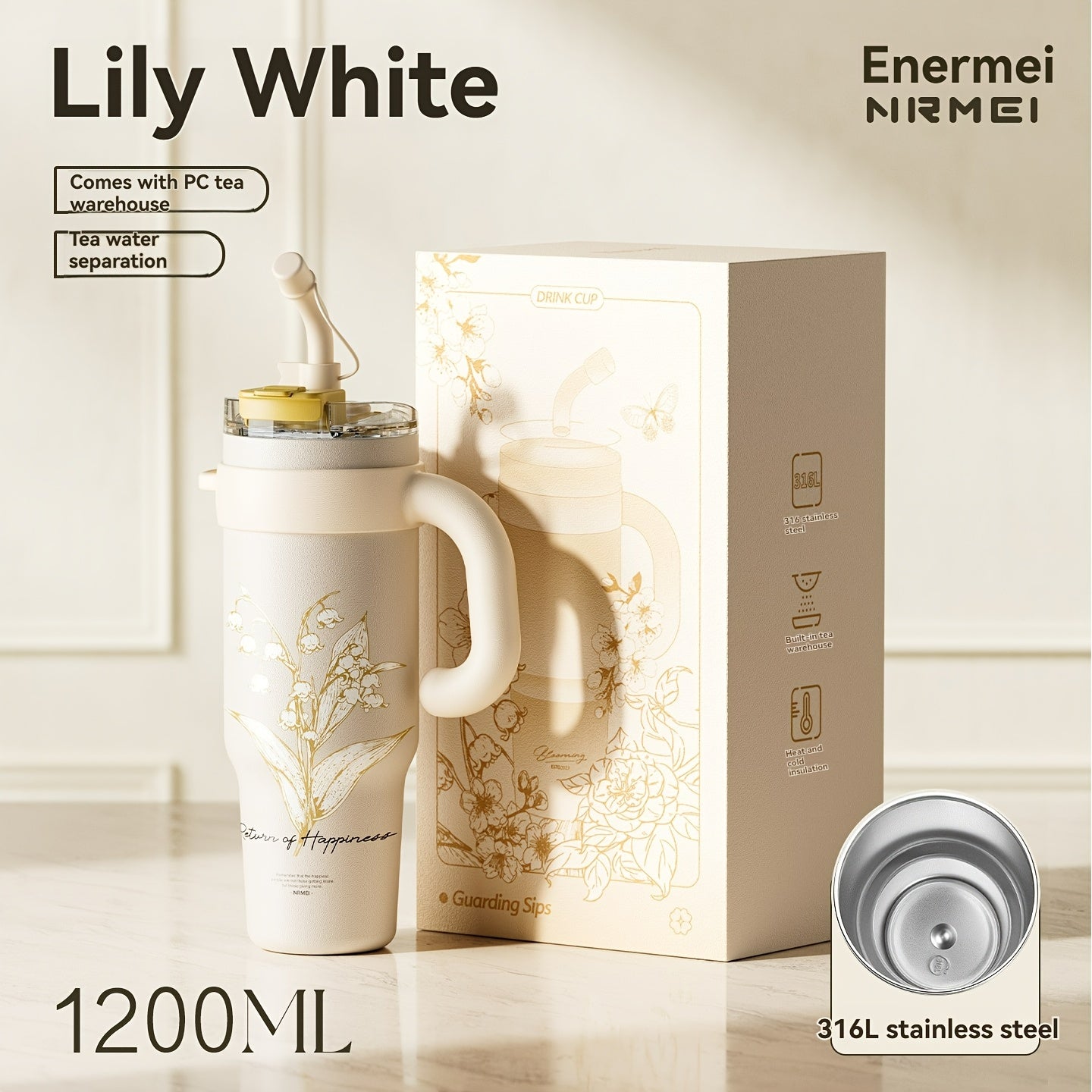 Garrafa de água NRMEI de aço inoxidável de 1,2 litros com pega - Boca dupla - À prova de fugas - Adequada para suportes de copos de automóvel