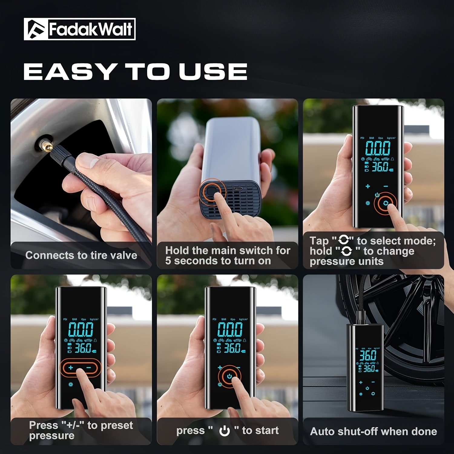 Recomendação: Bomba de ar de alta velocidade de 150 PSI com visor digital inteligente e luz de emergência para reparação de pneus. Adequada para encher carros, motas, bicicletas e diversos tipos de bolas. Versão preta obsidiana.