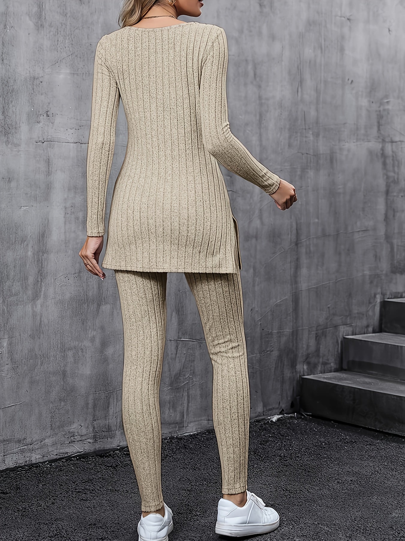 Conjunto de duas peças canelado com abertura lateral, composto por t-shirt de manga comprida e calças, para uso casual. Roupa feminina.